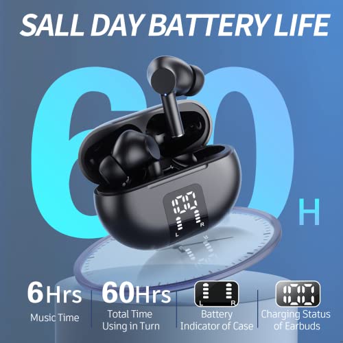 【Bluetooth 5.3 & All-day Battery Life】Wireless Earbuds “Faster-Auto-pair” with your phone through ➤ 5.3 Bluetooth model Power-saving and stably after first time pair. Bluetooth Headphones with ➤ Dual LED battery display show the remaining juice of charging case by the number, so you can charge it in time. Up to ➤60hrs of total listening time in turn, one earbud can be used for 5hrs on one charge. The case can provide extra 5 times the full charge for earbuds after ➤1.5Hrs fast charging by type-c